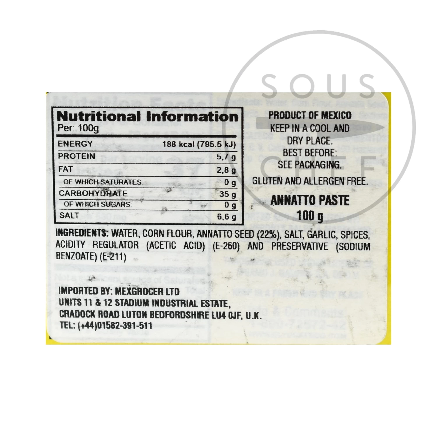 Ingredients 100g: Water, corn flour, annatto seeds (22%), salt, garlic, spices, acidity regulator(acid acid) E260 and preservative (sodium benzoate) E211.