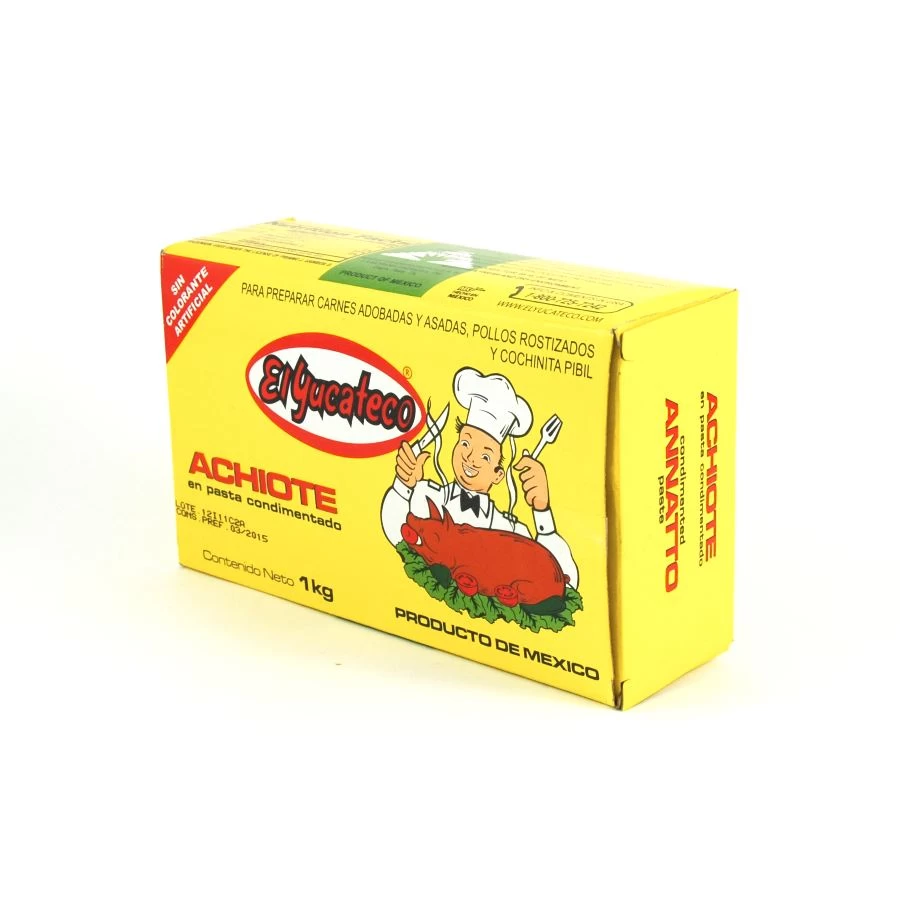 Ingredients 1kg: water, annatto seeds, corn flour, salt, garlic, spices, acetic acid, sodium benzoate – as a preservative.