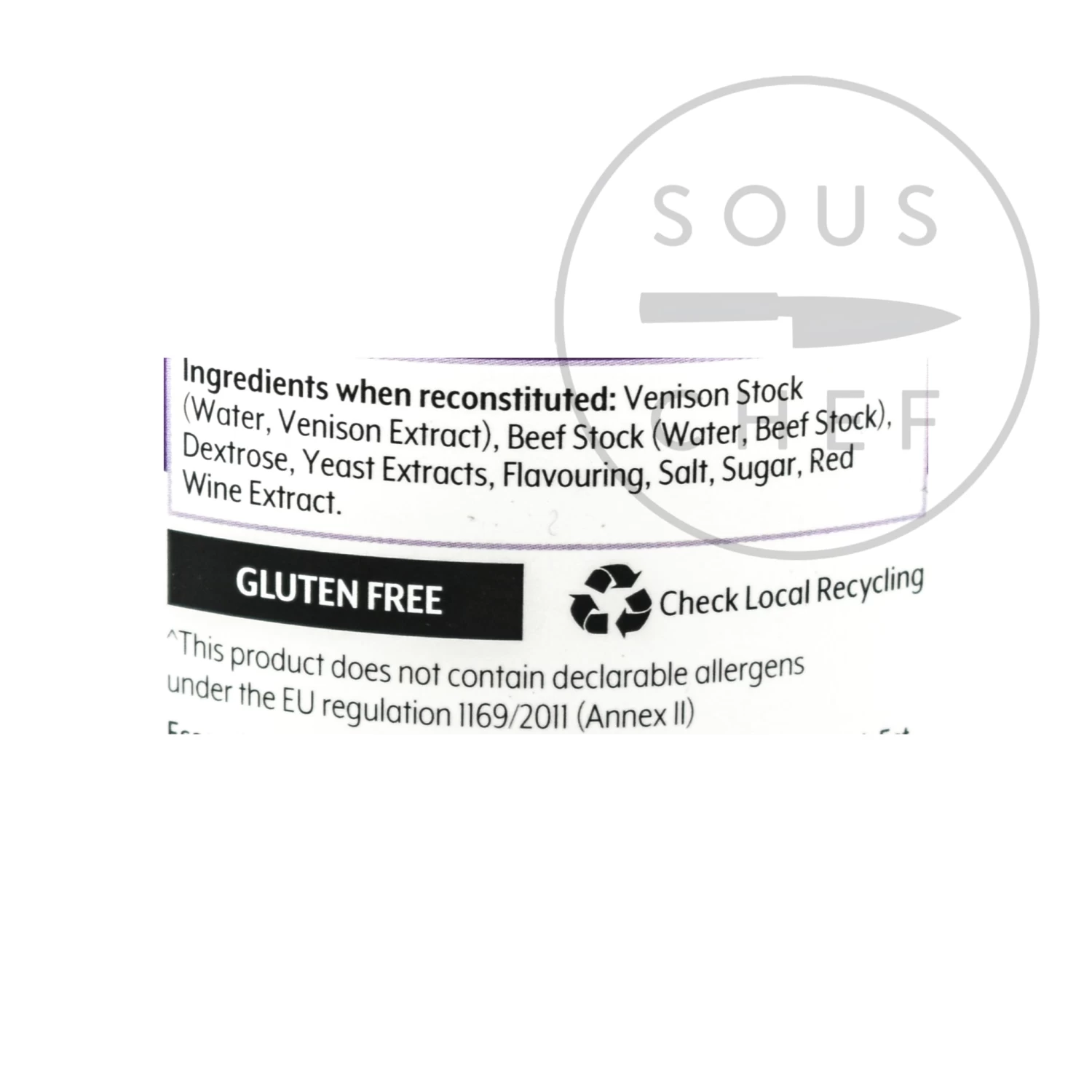Ingredients: Venison stock (water, venison extract), beef stock (water, beef stock), dextrose, yeast extracts, flavouring, salt, sugar, red wine extract.