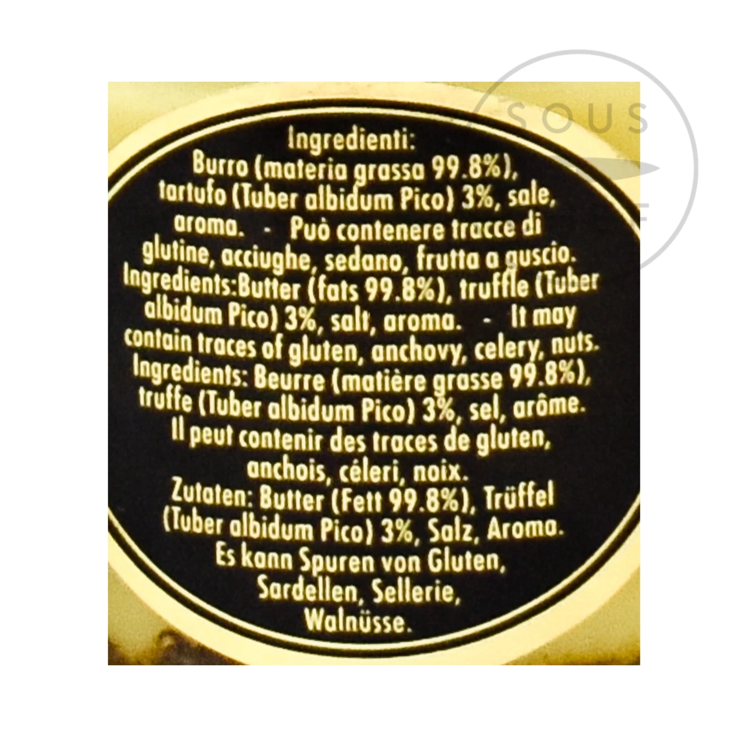 Ingredients: Butter, truffles (tuber borchii vitt) 2%, salt, truffle aroma. Made in a factory which handles wheat, milk, celery, anchovies, nuts.